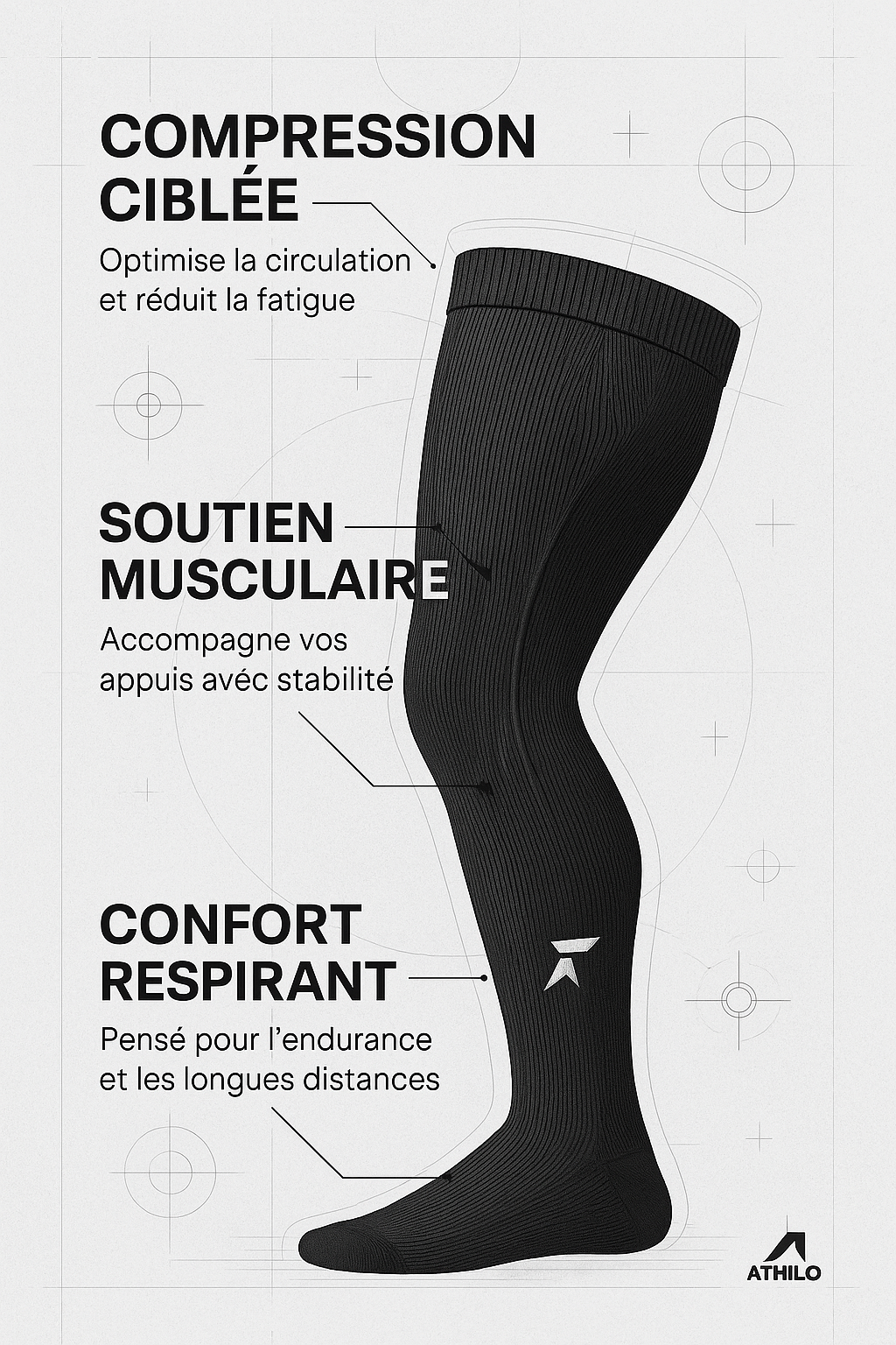 Nos bas de compression ATHILO optimisent la circulation, réduisent la fatigue et offrent un maintien musculaire fiable.